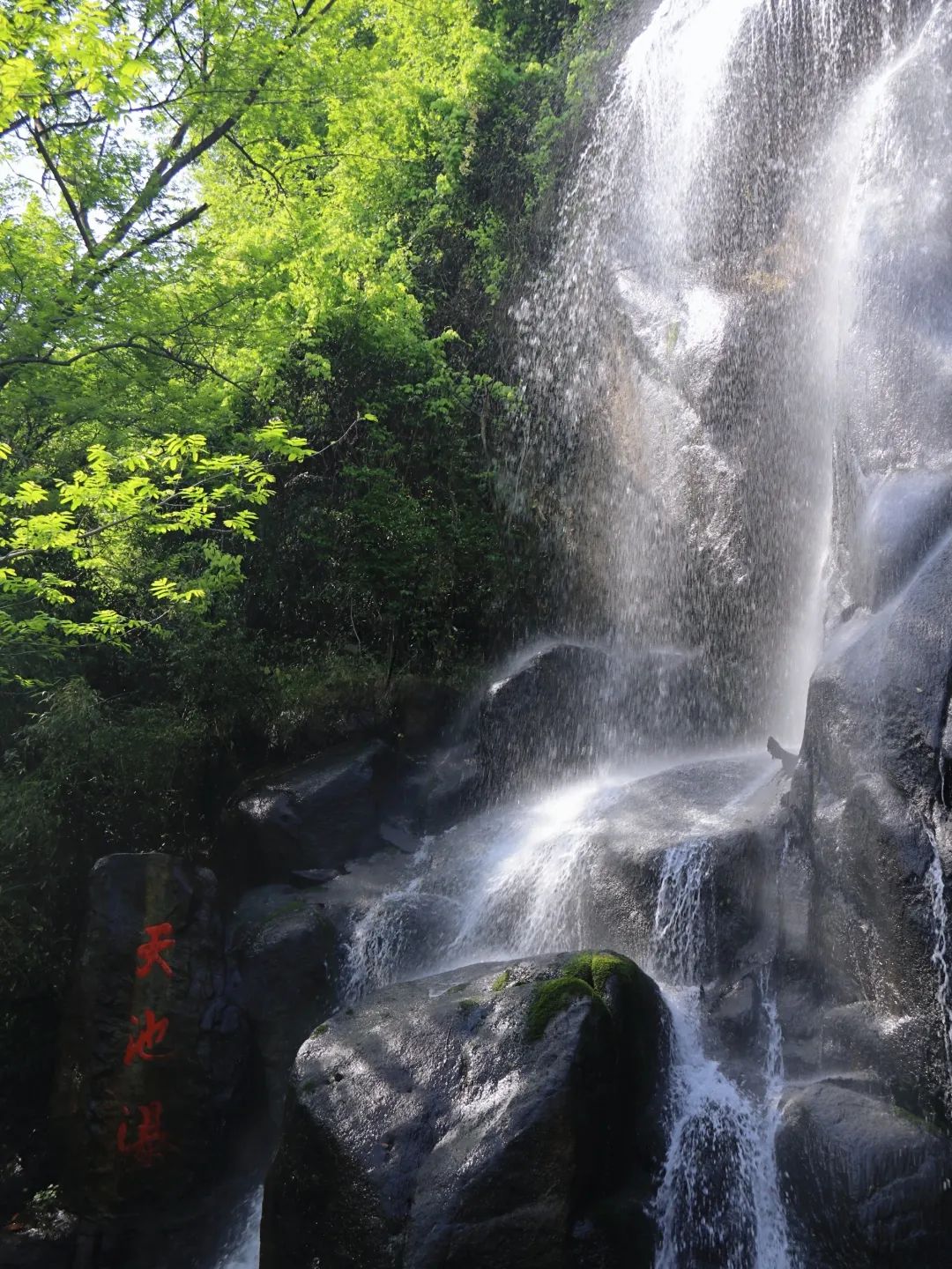 群山环抱间,一池碧水如天镜坠落,倒映竹海苍翠、飞瀑如练。冰川漂砾静卧湖畔,奇树怪石点缀溪谷,平湖似玉嵌于峰峦之间。