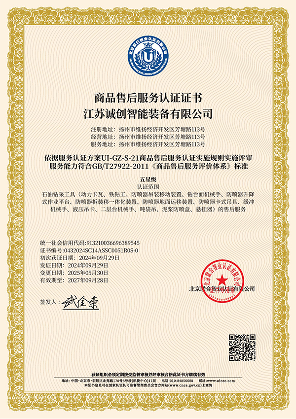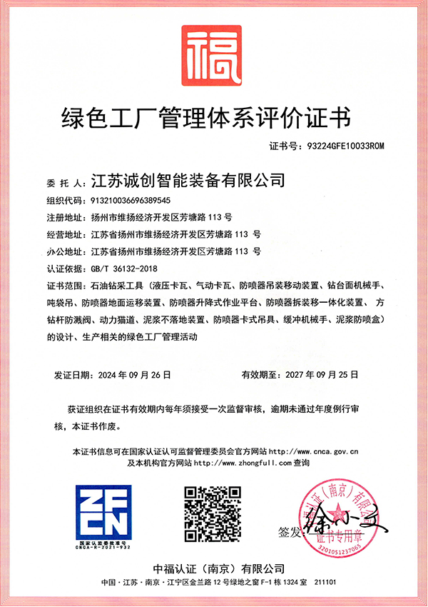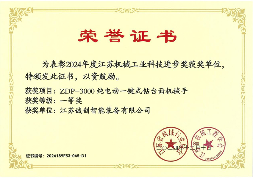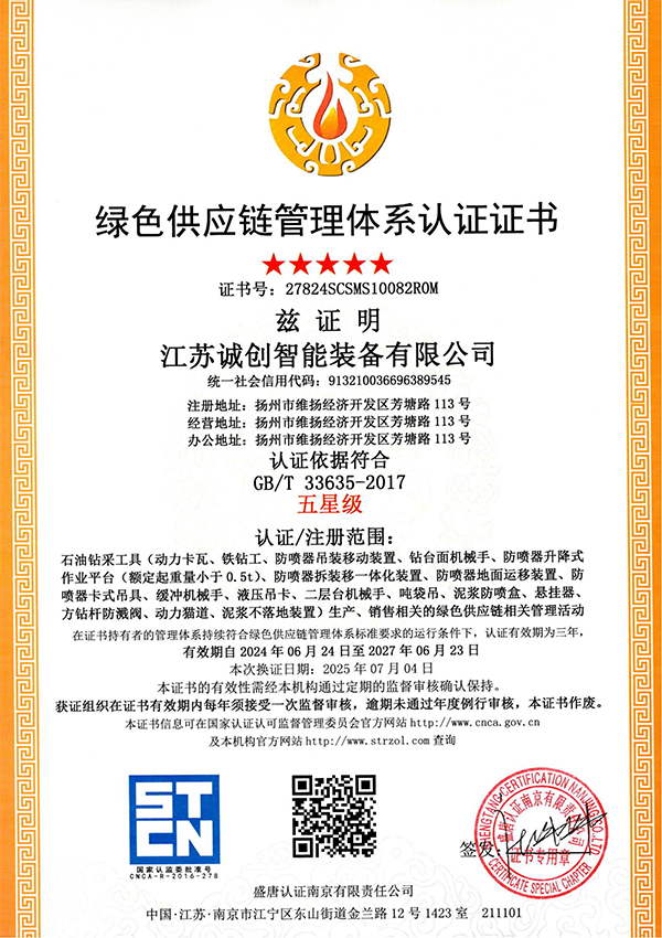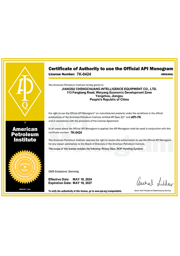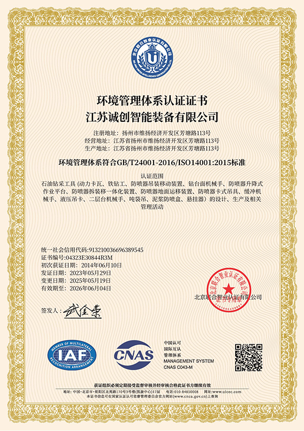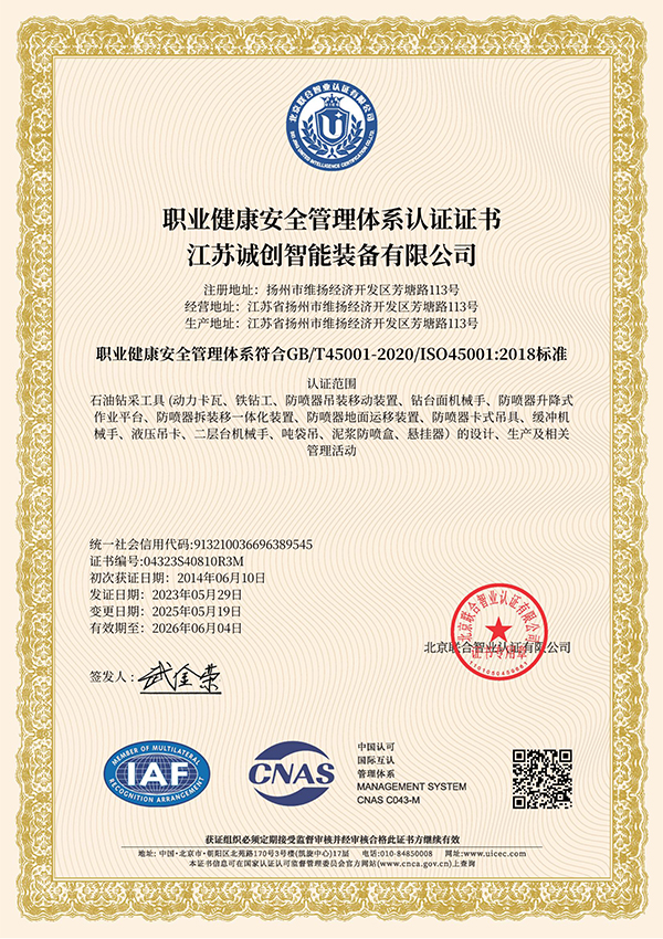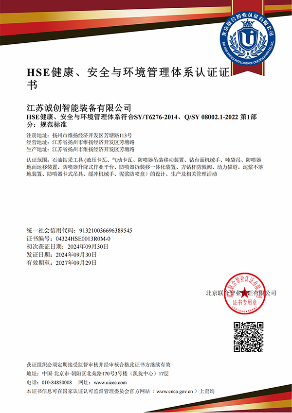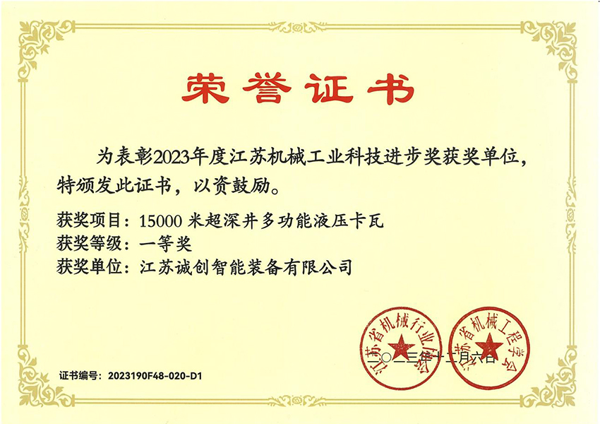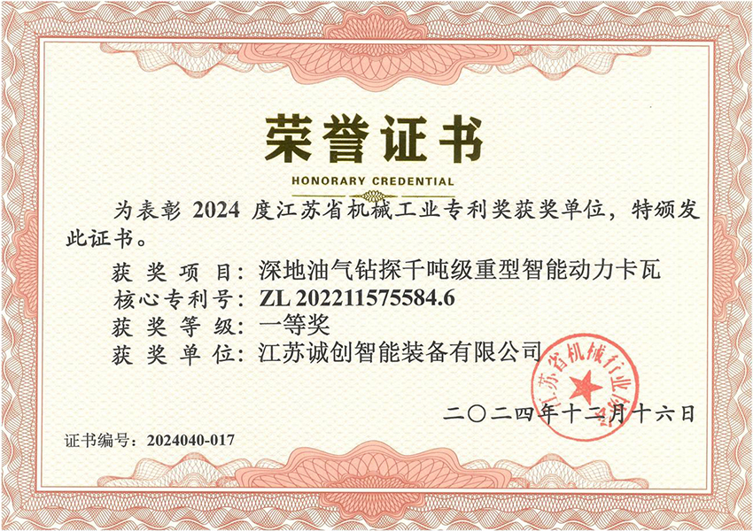 江苏诚创 —— 国家专精特新小巨人企业,2007年创立于扬州,长期专注油气钻探井口装备数智化、安全化新品研发,通过了美国石油学会API认证。核心优势产品 —— 液压卡瓦、防喷器吊装移动装置处于行业技术领先水平,助力国家首口超万米科探井胜利万钻。参与制定动力卡瓦行业标准,牵头起草防喷器吊装移动装置团体标准,执笔编写首部《中国陆上石油钻机2023》白皮书 —— 动力卡瓦、防喷器吊装移动装置章节。